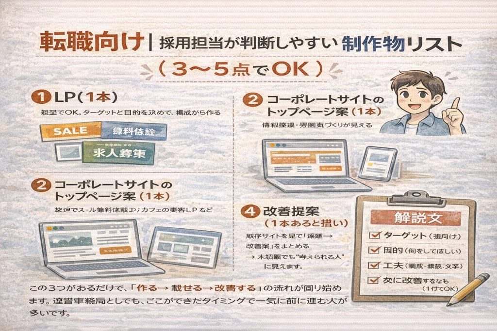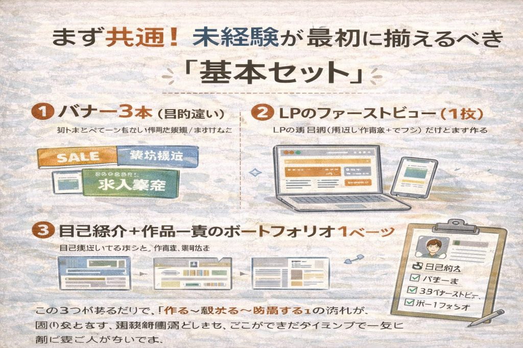 未経験が最初に作るべき制作物は、転職と副業で優先順位が変わります。共通の土台として「バナー3本+LPの一部+ポートフォリオ1ページ」を揃えたうえで、転職なら“採用担当が判断しやすいセット(LP・トップ案・改善提案)”、副業なら“売りやすい制作物(バナー・SNS画像・軽い更新)”を増やすのが近道です。